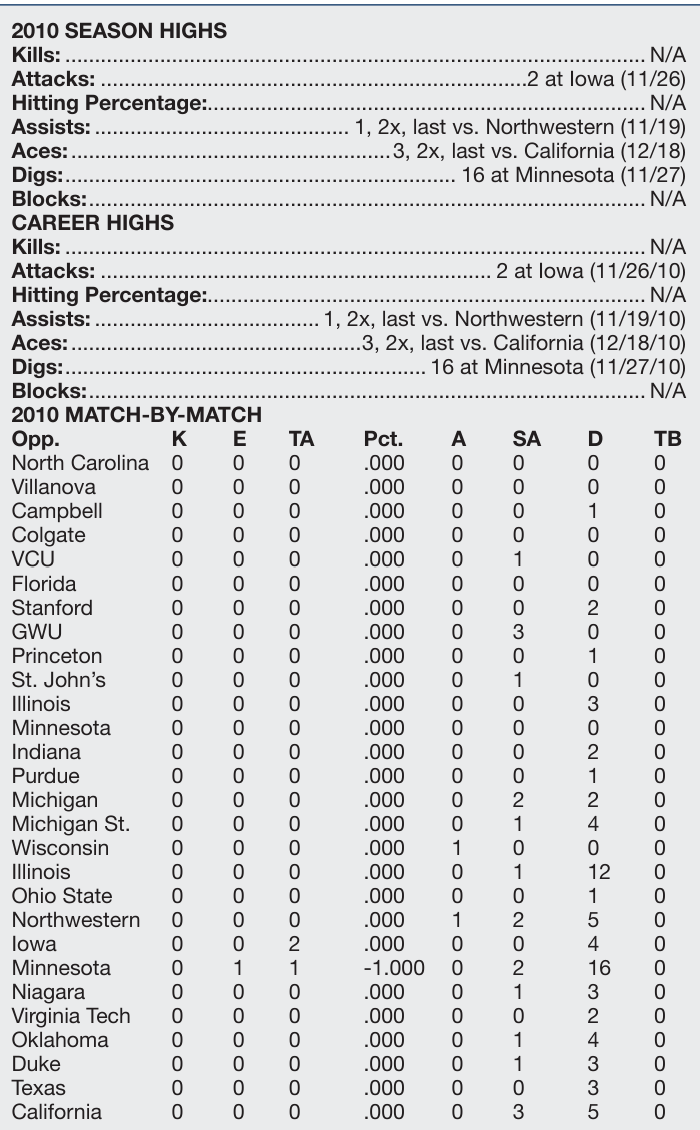 2010 Season (Freshman) Season Recap: 2010 National Champion … saw action in 29 matches and 64 sets as a serving and defensive specialist … made her collegiate debut at North Carolina (8/27) … tied for 3rd on the team with 20 aces … registered an ace in 13 matches and had 5 matches where she tallied 2 or more … recorded a personal-best 3 aces vs. George Washington (9/17) … totaled 74 digs for the season … had at least 1 dig in 18 matches with 15 multiple-dig matches … led the team with 12 digs against Illinois (11/13) … was 2nd on the team with a personal-best 16 digs at Minnesota (11/27).
