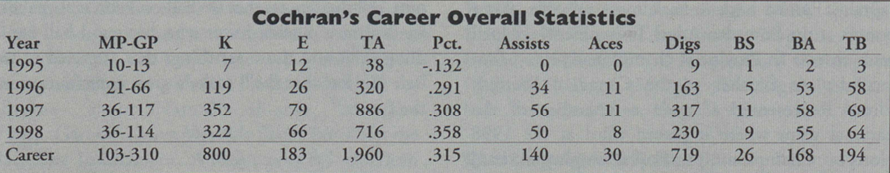 Before Penn State: Cochran started all four years for the Bethlehem Catholic High School volleyball and basketball squads; an outside hitter and middle blocker, she was a three-time All-State selection; MVP of the Eastern Penn Conference and District II in 1993 and 1994; twice selected as the Express TImes Player of the Year as she led the Hawks to the state semifinal match in 1994 and the finals in 1991; the two-time team captain played in the 1995 Mizuno All-Star game; a two-year starter for the Quickset Elite Volleyball Club team; Cochran was equally successful on the basketball court, earning all-conference and all-area accolades three times while guiding the Hawks to the state finals in 1991 and the semi-finals in 1993 and 1994; the National Merit Award Finalist led the league in rebounding and topped the 1,000 point plateau during her career as the squad captured four district titles and two conference Championships.