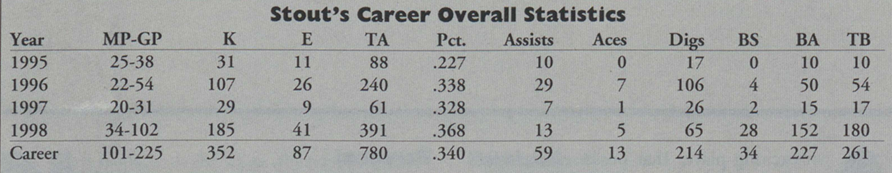 Before Penn State: Stout took full advantage of Seymour High School’s extracurricular athletic activities and participated in four sports, excelling on the volleyball court; she was an All-State selection in 1994 and garnered All-South Central Conference honors in 1993 and 1994; named to the Volleyball Monthly “Fab 50” list; the two-time captain led the Owls to the conference title and advanced to the finals of the state tournament her senior year. Stout was a member of the 1994 Junior Olympic Elite Team; Seymour’s two-time team MVP was a member of the 1995 South team that faced the Northern All-Stars; she played doubles on Seymour’s tennis team, and she ran hurdles and long and high jumped for the track squad; she also competed on the floor and vault as a gymnast; Stout was also a member of the National Honor Society.