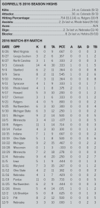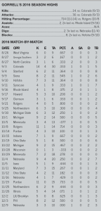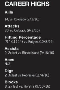 Season Recap: Started in all 34 matches, playing in every set at middle blocker … posted 201 kills, 121 blocks, 19 digs and 11 assists in 2016 … logged 6 kills on .667 hitting with 3 blocks in her collegiate debut against West Virginia (8/26) … recorded her first double-figure kill outing, posting 14 kills at Colorado (9/3), while also tallying 5 blocks, including 2 solo stuffs … led the team with a career-high 8 total blocks against No. 9 Stanford (9/4) … notched 8 kills on .545 hitting vs. Siena (9/9) … matched her season-high record with 8 blocks, including 2 solo stuffs, against Hofstra (9/10) … tallied 7 digs and 4 kills against Syracuse (9/11) … posted 5 kills and 2 blocks vs. Howard (9/17)… posted 4 kills on .800 hitting with a pair of blocks at Rutgers (9/21) … logged 8 kills and 4 blocks at Northwestern (9/25) … registered 6 kills, 2 blocks and 1 assist vs. No. 18 Michigan State (9/30) … finished 2nd on the team posting 9 kills and 5 blocks against No. 22 Michigan (10/1) … posted her second double-figure kill outing with 11 kills vs. Rutgers (10/8) to go 3 blocks … led the blocking unit with 3 kills and posted 4 blocks and a dig against No. 22 Purdue … tallied 7 kills on .667 hitting and posted 2 blocks vs. Indiana (10/15) … led the team with 6 blocks, including 3 solo stuffs against No. 19 Ohio State (10/19) … notched 9 kills, 2 digs and 2 blocks vs. No. 16 Michigan (10/22) …. charted 7 kills against No. 3 Minnesota (10/29) … led the defense posting 7 blocks to go along with 9 kills and 2 digs vs. No. 1 Nebraska (11/4) … posted 5 kills and 3 blocks against Iowa (11/5) … notched 7 kills and 2 blocks vs. Maryland (11/11) … put down 4 kills and 3 blocks, including one solo stuff, against Ohio State (11/12) … recorded 11 kills and 5 blocks against No. 1 Nebraska (11/16) … lLogged 6 kills and 3 blocks vs. Northwestern (11/25).